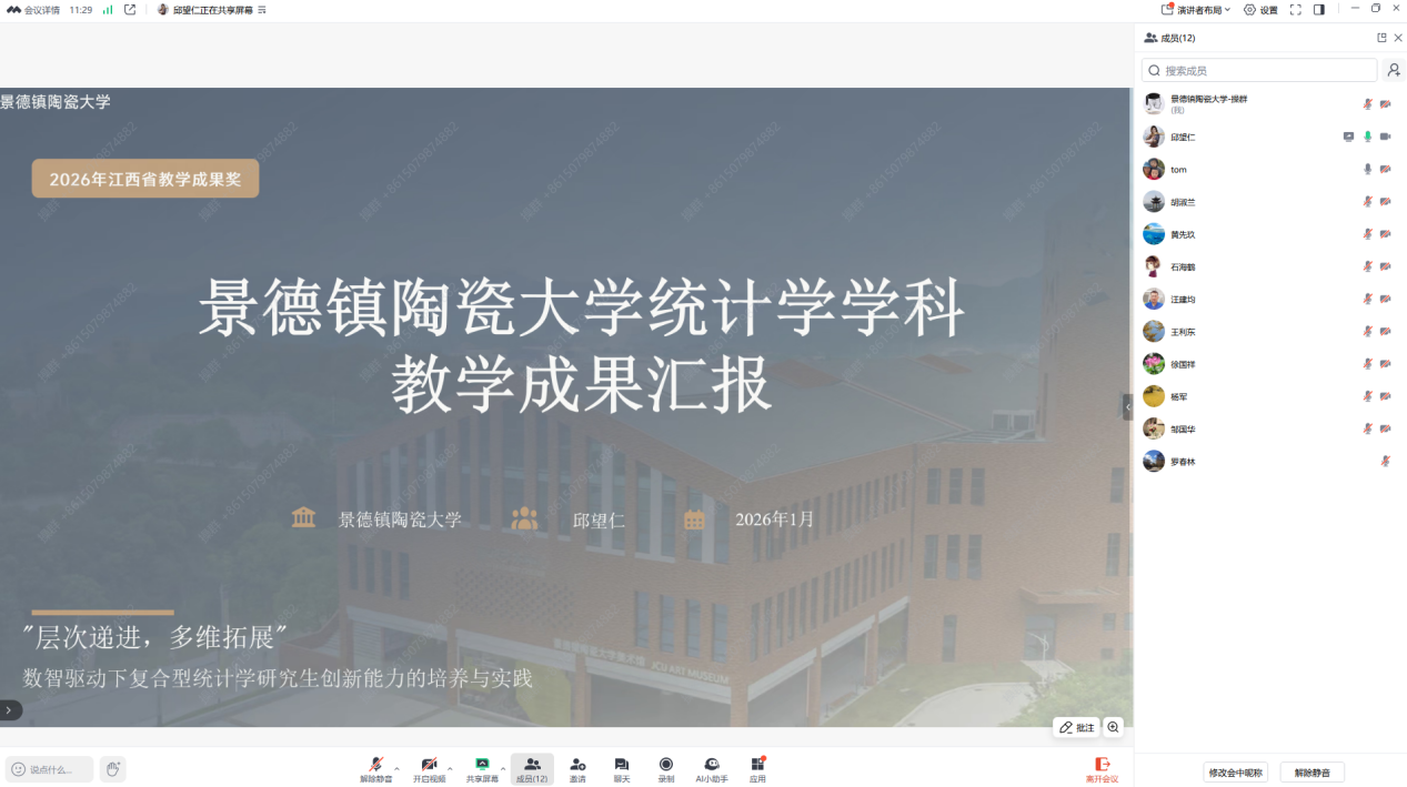 汤可宗教授代表成果完成单位,对专家们的专业指导表示感谢。他表示专家提出的宝贵意见为成果的进一步优化与推广指明了方向,学院将以此次鉴定为契机,立足学校数智陶瓷产业特色,持续深化数智背景下统计学复合型研究生人才培养过程,不断提升统计学人才培养质量,为数智产业发展与国家战略需求输送更多优质人才。