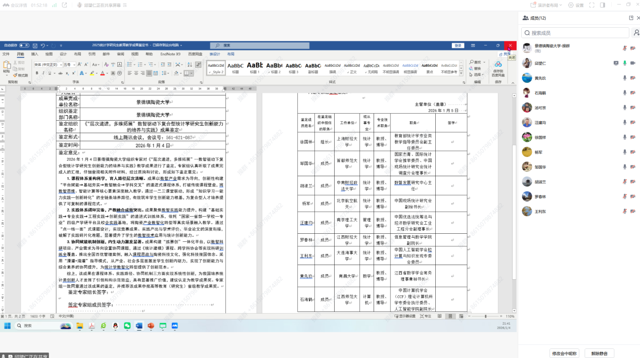 2026年1月4日,我院《“层次递进,多维拓展”数智驱动下复合型统计学研究生创新能力的培养与实践》(研究生教育类)教学成果鉴定会通过线上形式顺利召开。本次会议由教育部高等学校统计学类专业教学指导委员会副主任委员徐国祥教授主持,北京航空航天大学、中南财经政法大学、江西财经大学等统计学教育领域知名专家组成鉴定委员会,成果团队主要成员参会。