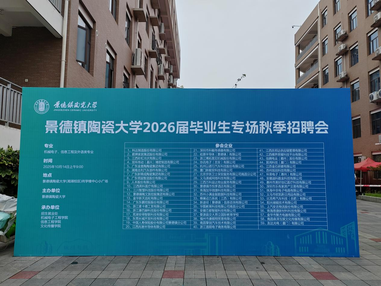 为扎实推进就业工作,紧抓秋季就业黄金期。10月14日上午,信息工程学院与机械电子工程学院、文化传播学院联合举办的2026届毕业生秋季专场招聘会在景德镇陶瓷大学湘湖校区尚学楼中心广场举行。