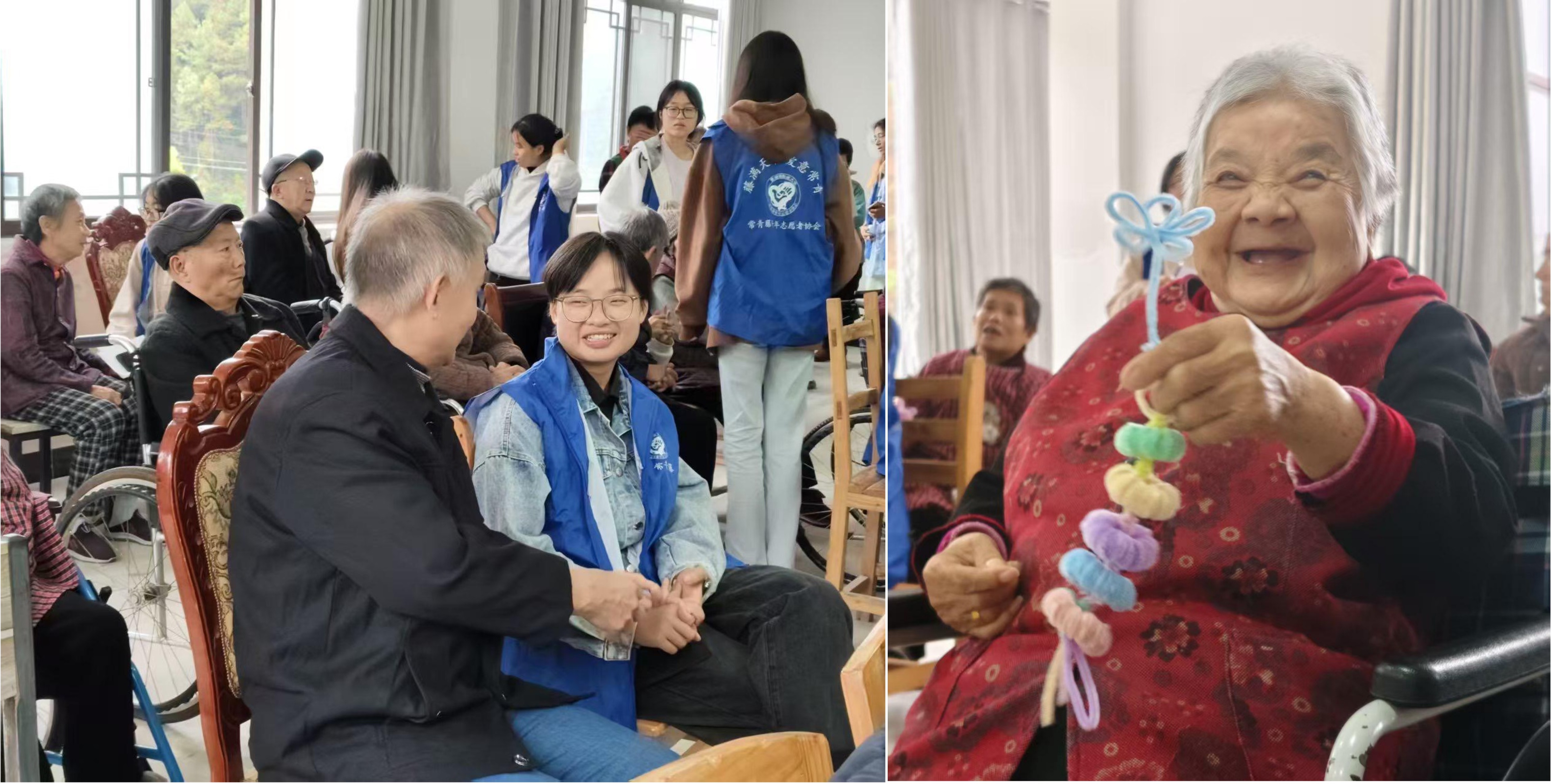2025年11月8日常青藤青年志愿者协会前往景东老年公寓开展“陶暖金秋·情系夕阳”敬老院爱心志愿服务。志愿者们为老人们表演了提前排练好的乐器演奏和歌曲合唱,老人们也纷纷自发上台一起载歌载舞。随后还和老人们共同完成了编织扭扭棒等小作品,简单的小物件中流露着温情,轻松的氛围中传递着欢乐。紧接着志愿者们为老人们打扫了房间,也为行动不便的老人们送去了扭扭花和贺卡表达心意,留下纪念。