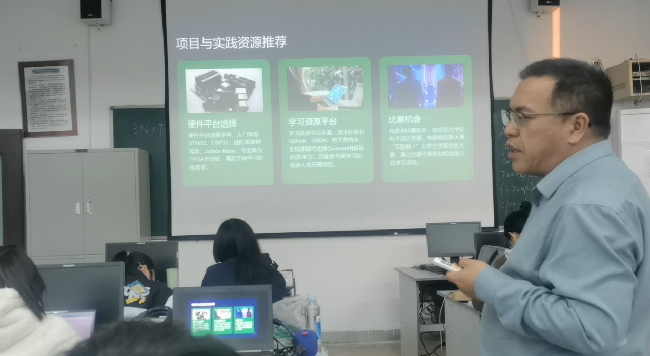 信息工程学院2022级计算机科学与技术专业近日开展“产业精英进课堂”专题活动,《项目实训》课程负责人李娟老师邀请了三位行业资深工程师走进校园,通过案例分享、技术解析与项目实战指导,为130余名学生带来嵌入式系统设计的沉浸式学习体验。