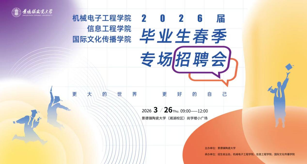 3月26日上午,信息工程学院与机械电子工程学院、国际文化传播学院在景德镇陶瓷大学湘湖校区尚学楼中心广场联合举办2026届毕业生春季专场招聘会。