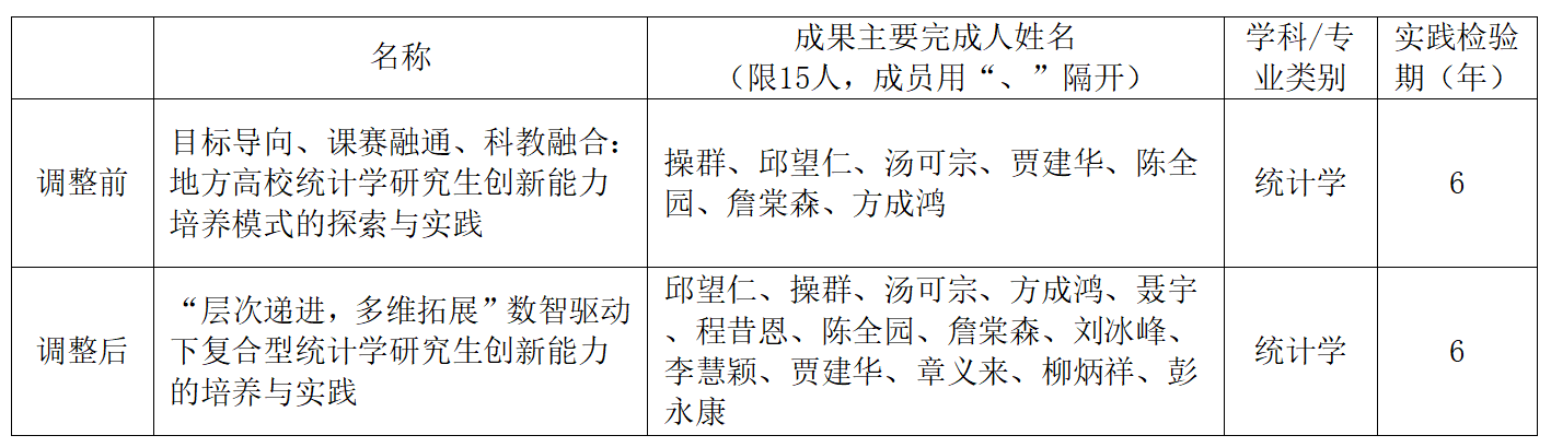 根据关于2026年江西省教学成果奖评选推荐工作的相关通知要求,为保障教学成果申报工作的准确性和规范性,经团队申请,学院审核,对相关成果的名称及完成人进行调整。现就调整后的拟推荐成果信息予以公示。