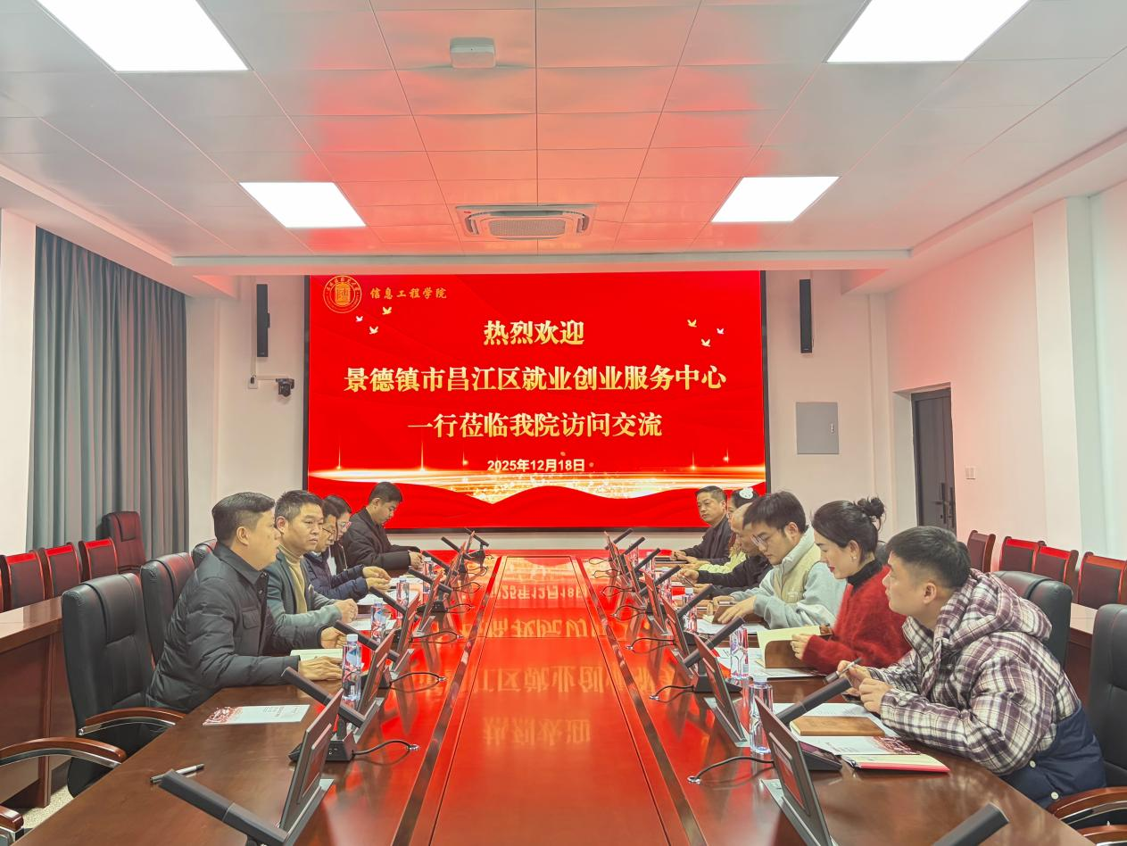 为推动人才供需对接,助力学生高质量就业。2025年12月18日景德镇市昌江区就业创业服务中心一行来我院调研交流,信息工程学院党政领导班子成员、昌江区就业创业服务中心领导班子成员等出席会议,会议由院党委副书记吴强主持。